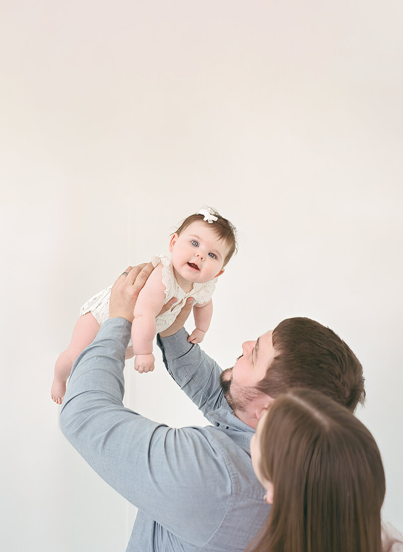 A: Simplicity is key! Neutral tones, soft textures, and no logos or bright patterns photograph beautifully in this clean space. I’m happy to help you choose something from home—or you can use my studio wardrobe options for babies and toddlers.